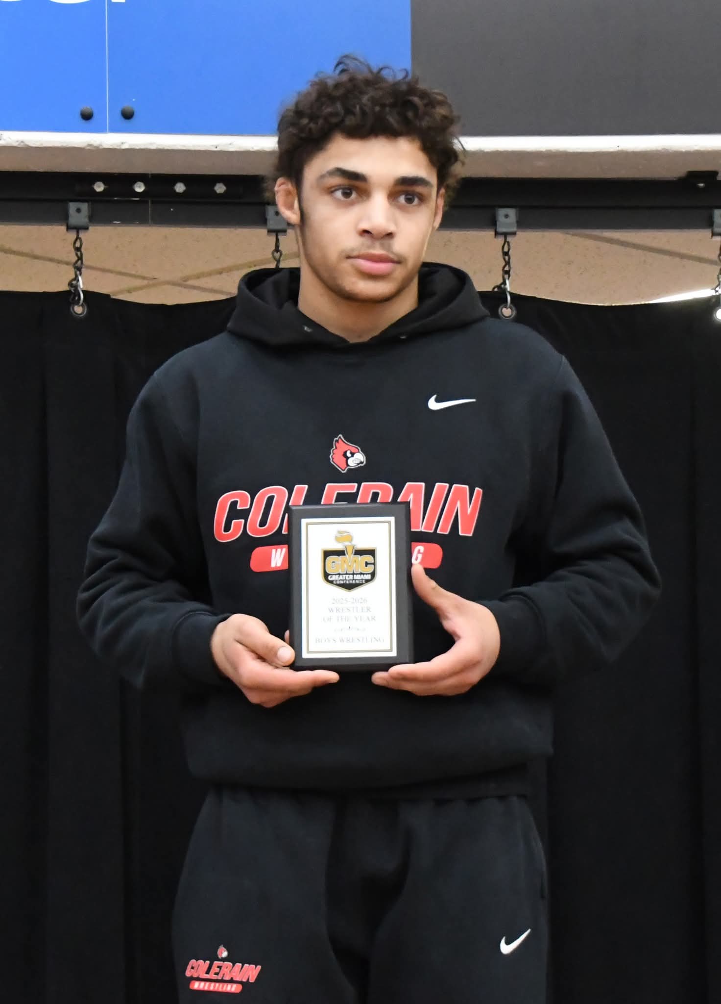 On the boys’ side of the mats, Colerain senior Demarco Kates was once again a dominant force. The GMC “Wrestler of the Year” in both 2025 and now 2026, he is a three-time first-team all-conference performer. He first earned those honors at 106 pounds, moved up to 113 the following season, and this year competed in the 120-pound weight class.